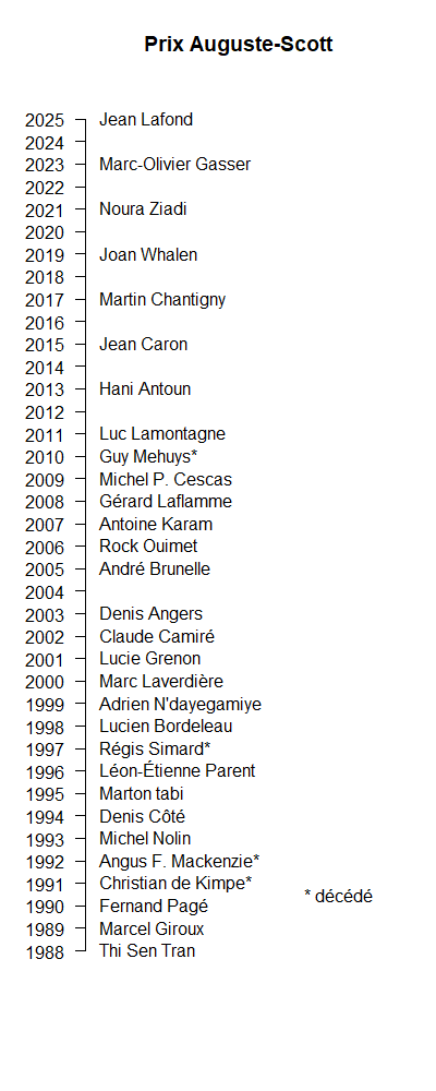 Les récipiendaires du prix Auguste-Scott sont les suivants :